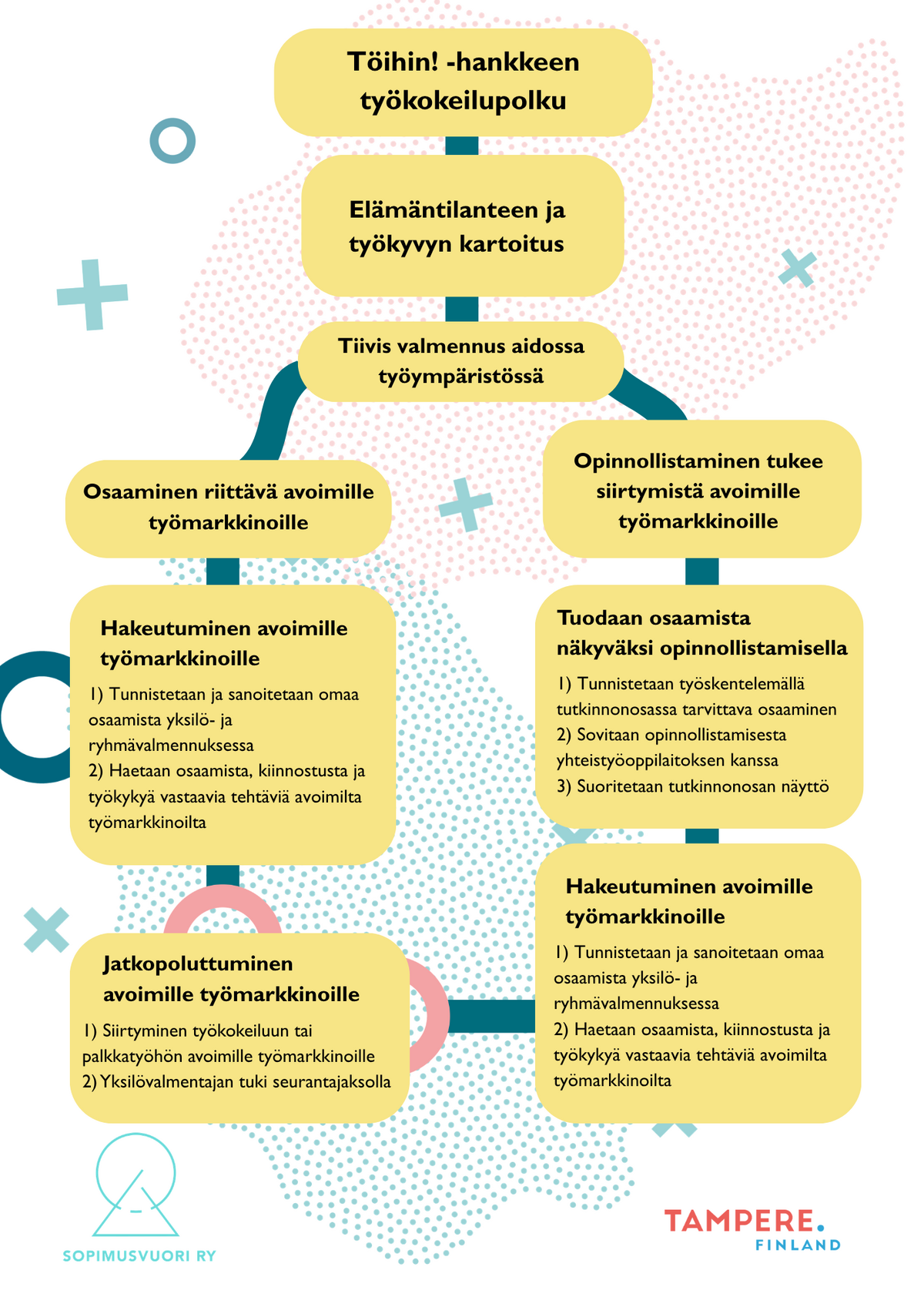 Töihin! -hanke tarjoaa tamperelaisille työnhakijoille työkokeilujaksoja Sopimusvuori ry:n monipuolisissa työtehtävissä. Meillä voit työllistyä esimerkiksi kokoonpano- tai viestintätehtäviin sekä ohjaus- tai puhtaanapitoalalle.